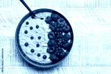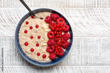 Healthy oatmeal with fresh raspberries, red currant and almond nuts in blue bowl on white wooden background. Top view.
