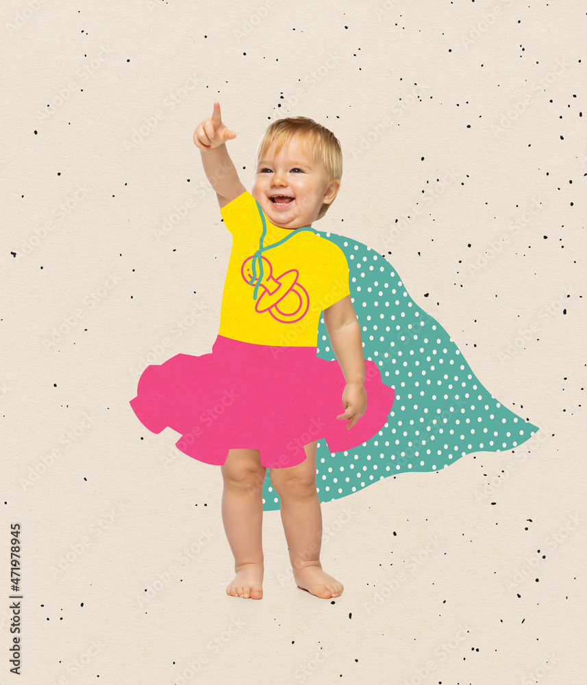 Contemporary art collage of little baby, boy in character of superman weaaring cloak isolated over beige background