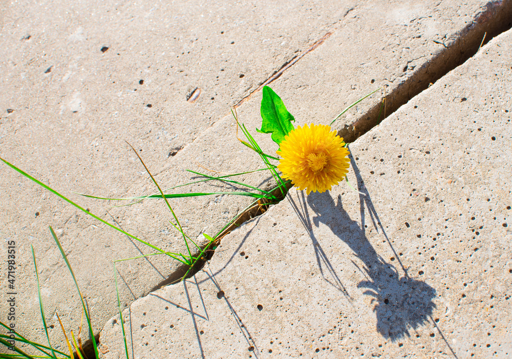 The concept of survival, ecology, globalization. Plant grows through concrete cracking. Sprout of a plant makes the way through a crack asphalt
