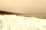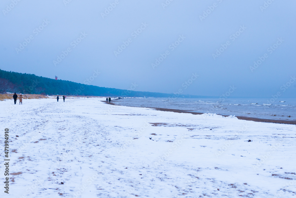 Winter landscape, people walking on winter sea beach