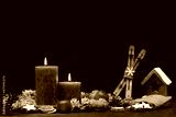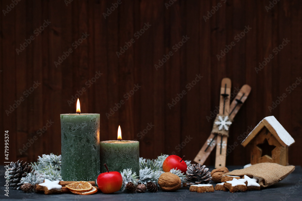 Rustikaler Weihnachtshintergrund mit Kerzen und Weihnachtsdekoration.