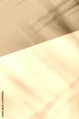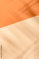 Warm orange and beige summer color background with tropical palm shadow. Two trend pastel paper and exotic plant shade layout. Minimal flat lay with leaf silhouette overlay.