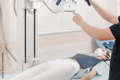 Doctor taking x-ray of patient lying on gurney. Hospital radiology room. Technician adjusting an x-ray machine. Female lying on a bed is scanning chest, heart, lungs in modern clinic office.