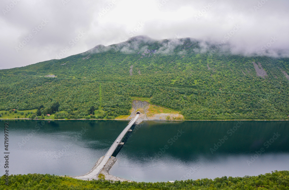 View from Mountain to the bridge across the river in Norway