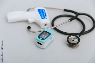 Stethoscope, pulse oximeter and thermometer gun on white background. Phonendoscope. Infrared isometric thermometer gun to check body temperature for virus symptoms. Treatment of cold or flu.
