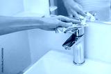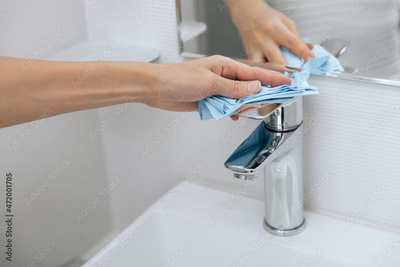 Cleaning the sink faucet with a microfiber cloth. Sanitize surfaces prevention in hospital and public spaces against corona virus. Woman hand using wet wipe. Cleaning the bathroom.