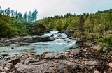 Mountain river with rocks and waterfalls in the forest in Norway
