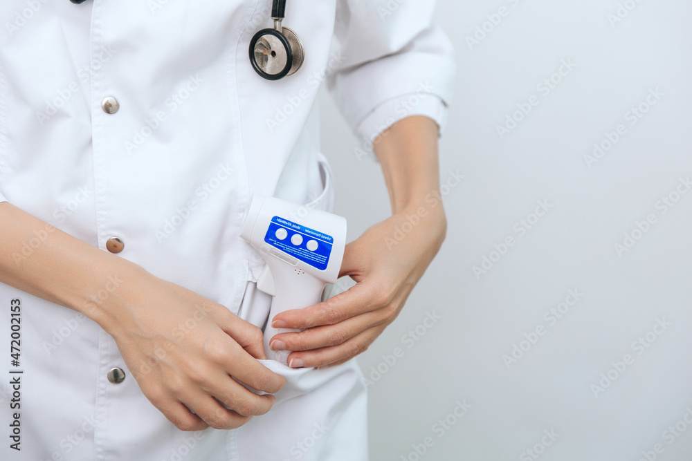 Temperature measurement gun in doctor hands. Close-up shot of doctor wearing protective surgical mask ready to use infrared isometric thermometer gun to check body temperature for virus symptoms.