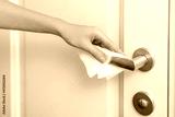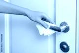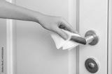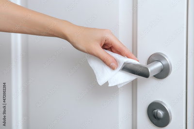 Cleaning door handles with an antiseptic wet wipe and gloves. Woman hand using towel for cleaning home room door link. Sanitize surfaces prevention in hospital and public spaces against corona virus.