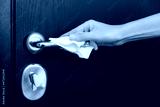 Cleaning black door handles with an antiseptic wet wipe. Sanitize surfaces prevention in hospital and public spaces against corona virus. Woman hand using towel for cleaning home room door link.