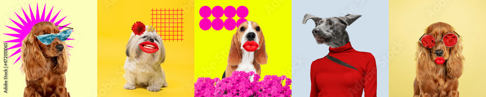 Contemporary art collage with cute purebred dogs and trendy colored backgrounds with geometric styled elements.