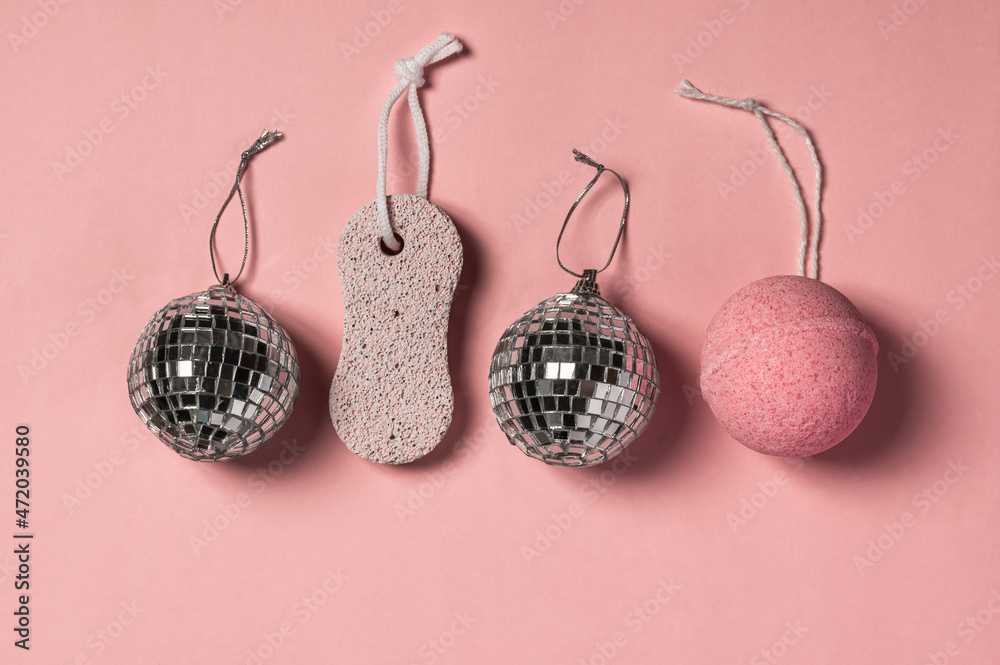 Gift concept: pumice stone, bath ball and mirror balls on pink background.New Year and Christmas background.