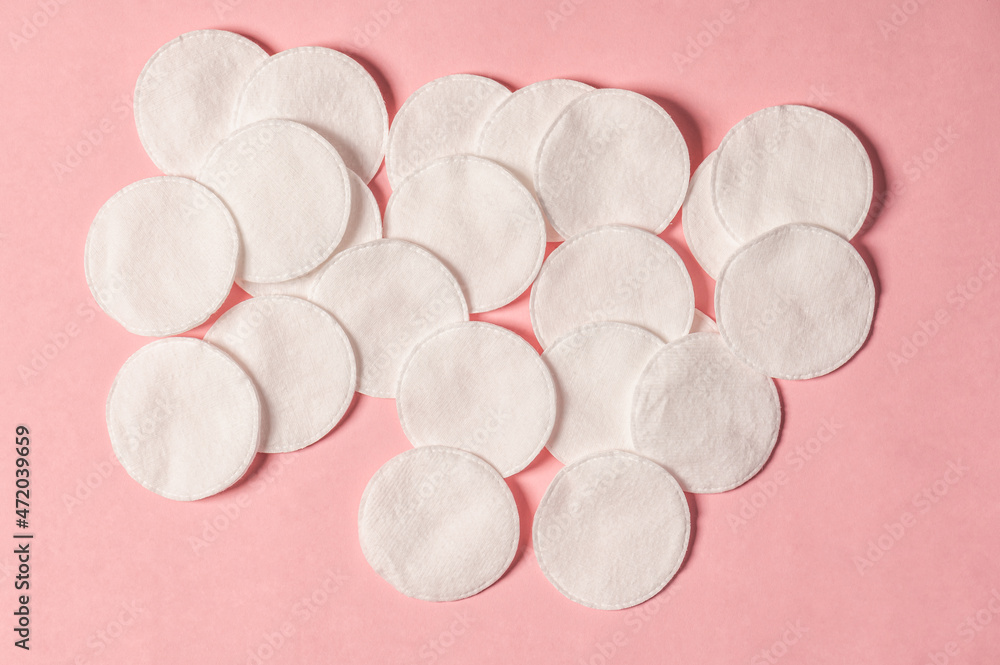 Cotton pads for personal hygiene on a pink background. Gentle make-up removal. Skin beauty and health.Top view.