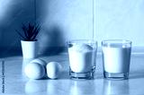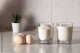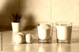 a glass with milk and a glass with sugar and three eggs on a white table.