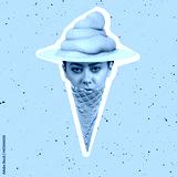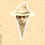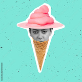 Contemporary art collage of female in shape of ice cream cone with delicious fruity flavored cream taste isolated over green background
