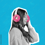 Contemporary art collage of young cal woman listening to music in headphones with pink donuts isolated over blue background