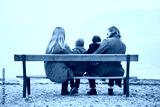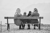 Family of 4 sitting on bench, enjoying nice autumn day by the lake, cold weather, back view