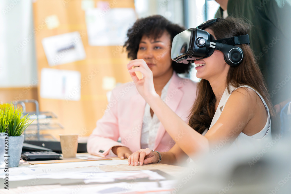 group of millennial male and female multiethnic using vr goggle to test metaverse meeting system cheerful and smiling,office friend standing discussion together next to window office background