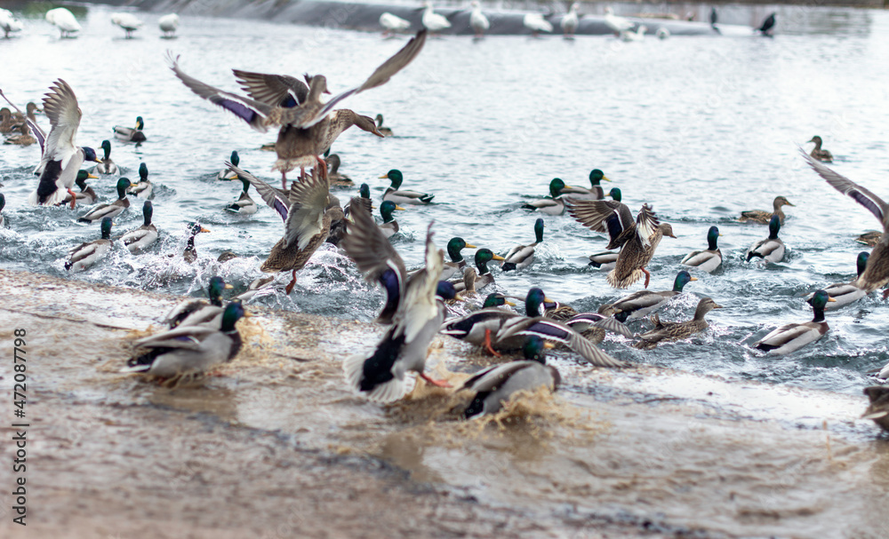 Beautiful Ducks on in the river in winter. Group of ducks starting to fly on the river ban flapping their wings.