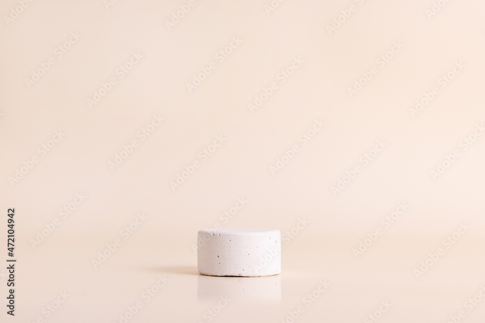 White concrete circle shaped pedestal on beige background. Podium mockup background for products. Advertising template. Stone platform. Abstract geometric