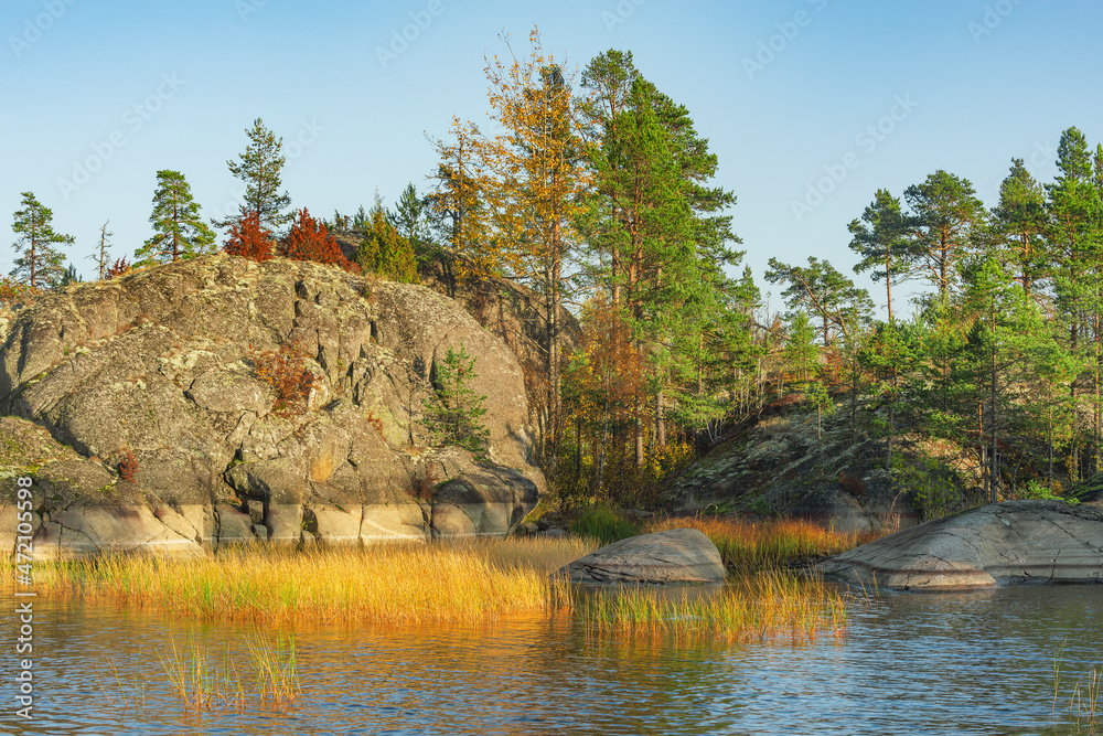 Trees on the cliffs of Lake Ladoga at autumn evening. Republic of Karelia.