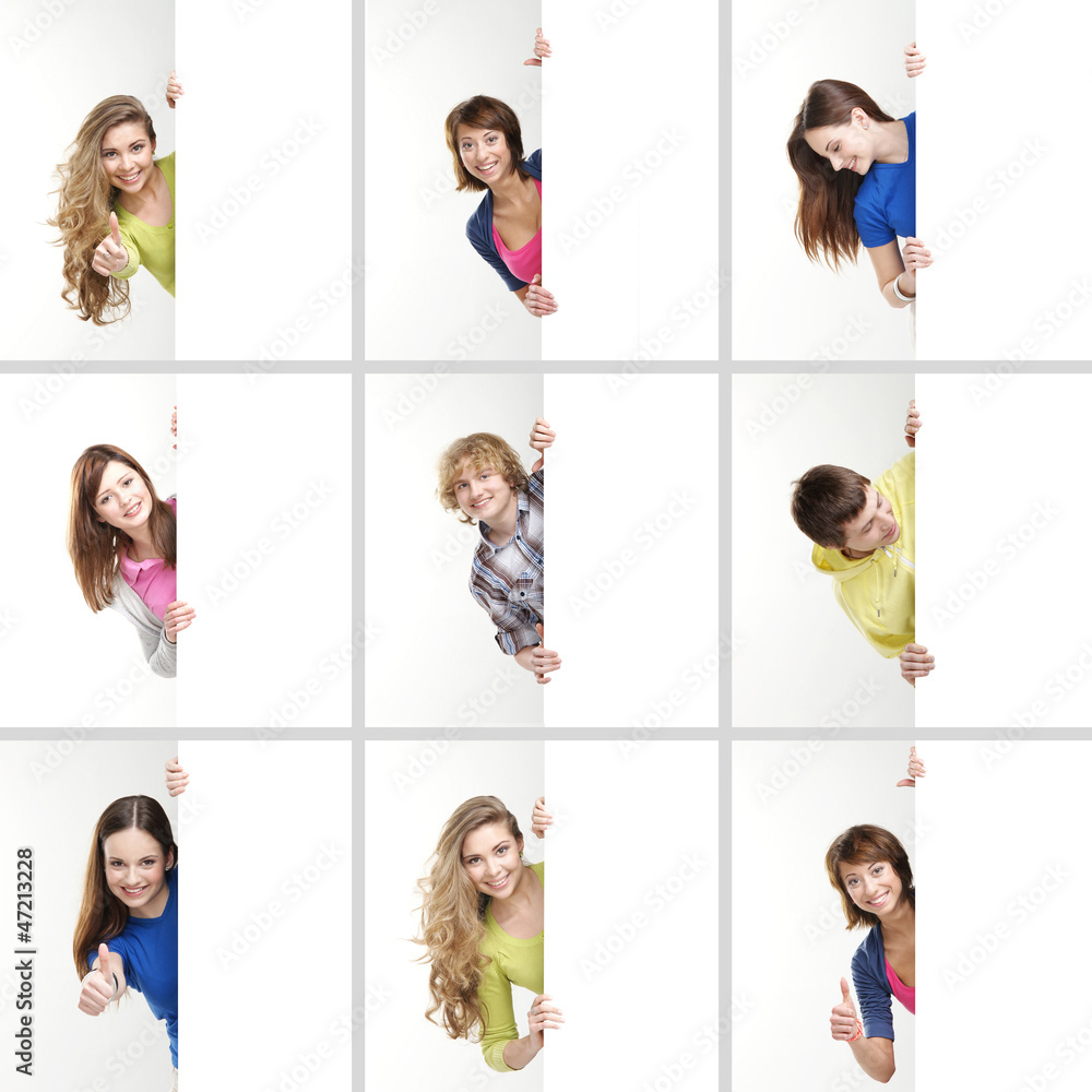 A collage of happy teenagers holding blank posters