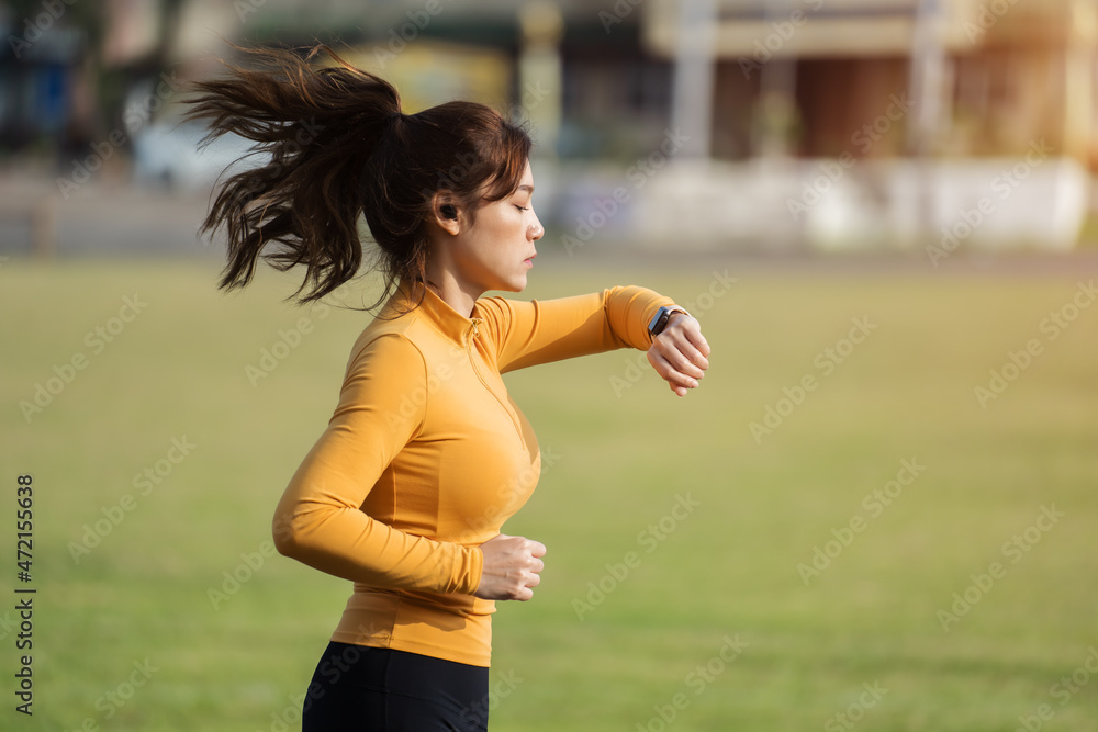 young woman running and looking at her smart wrist watch in park