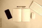 Blank notebook, a pencil, and space are on top of a blue office desk table. Flat lay, top view education concept