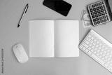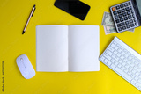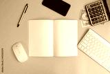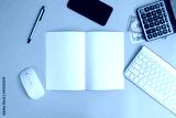 Office desk table with laptop, supplies and tablet. Top view with copy space, banking and finance concepts, web, wireless, work, workplace
