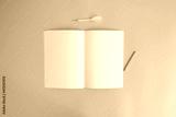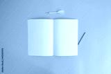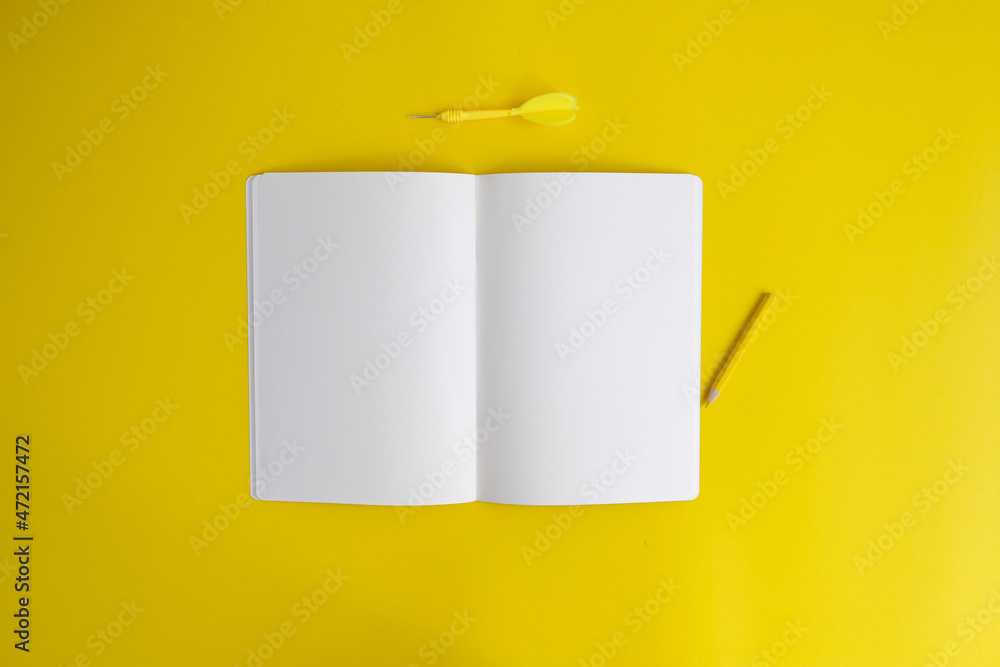 Blank notebook, a pencil, and space are on top of a yellow office desk table. Flat lay, top view.