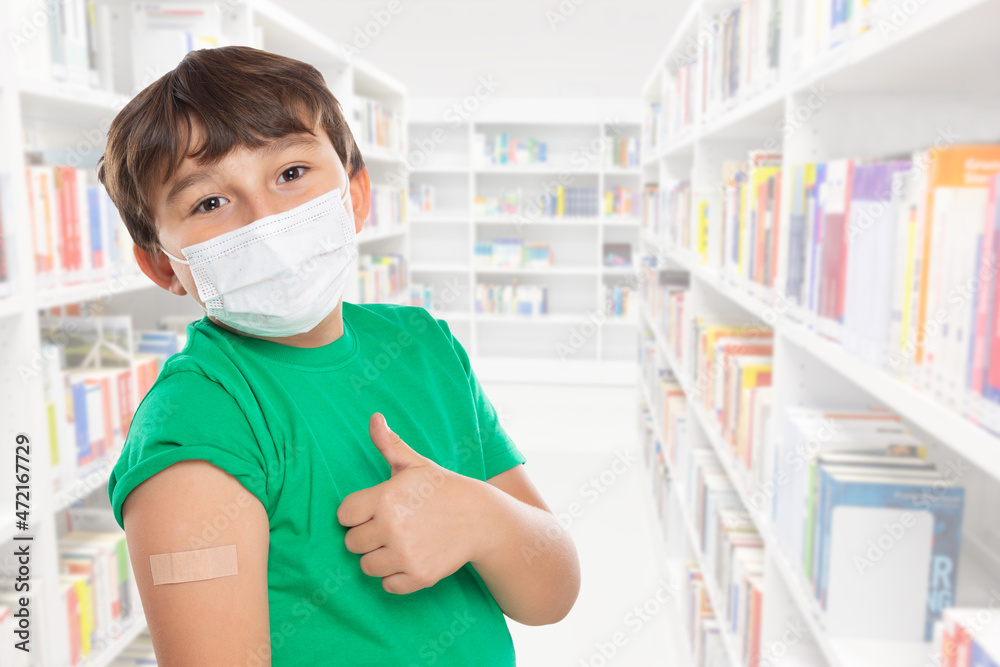 Child kid with plaster after Coronavirus vaccination wearing face mask against Corona Virus showing thumbs up at school COVID-19 Covid copyspace copy space