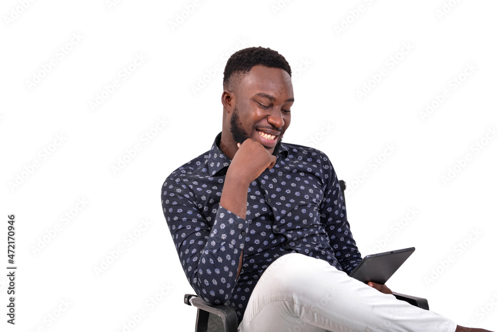 portrait of young man using tablet, smiling