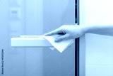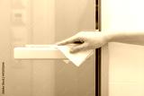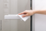 Cleaning glass door handles with an antiseptic wet wipe. Sanitize surfaces prevention in hospital and public spaces against corona virus. Woman hand using towel for cleaning home room door link.