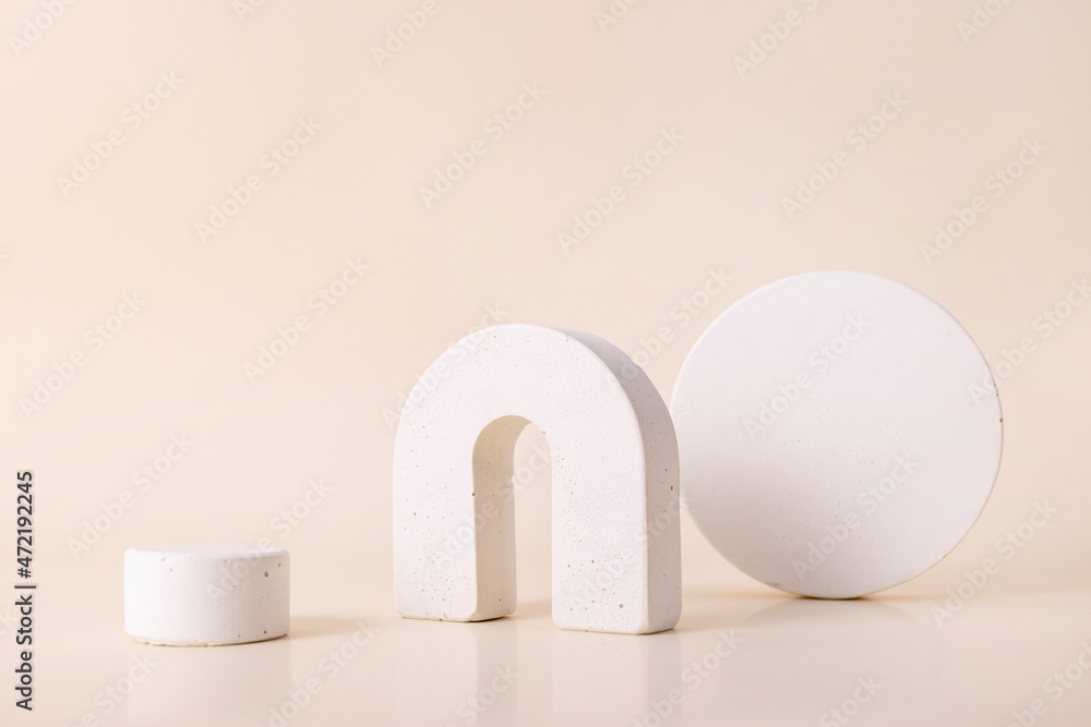White concrete circle shaped arch on beige background. Podium mockup background for products. Advertising template. Stone platform. Abstract geometric