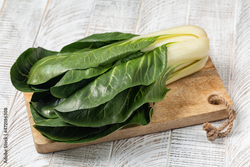 Whole swiss chard on wooden board: leafy green high-fiber vegetables, among the most nutrient-dense foods rich of antioxidants. Healthy lifestyle food..
