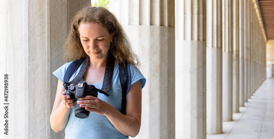 Tourist plays photos in camera at Stoa of Attalos, Athens, Greece