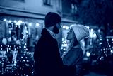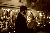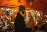 Happy hugging couple posing in street of European city. Christmas, winter holidays, vacation, New Year celebration conception. Outdoor night portrait. Copy, empty space for text