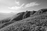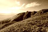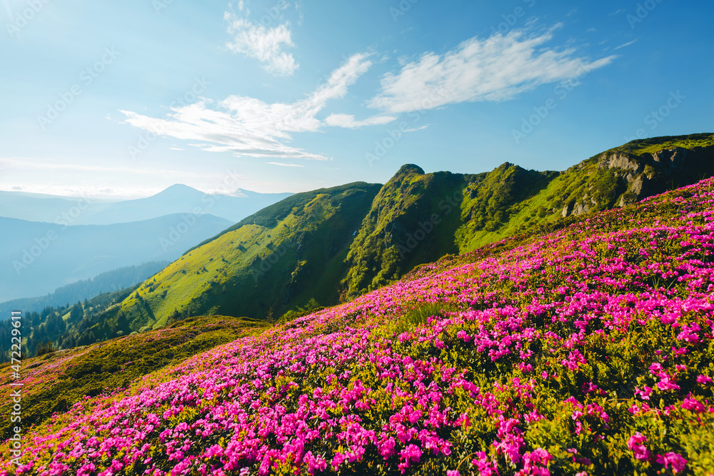 Splendid landscape in sunny summer day with pink rhododendron flowers. Carpathian mountains, Ukraine.