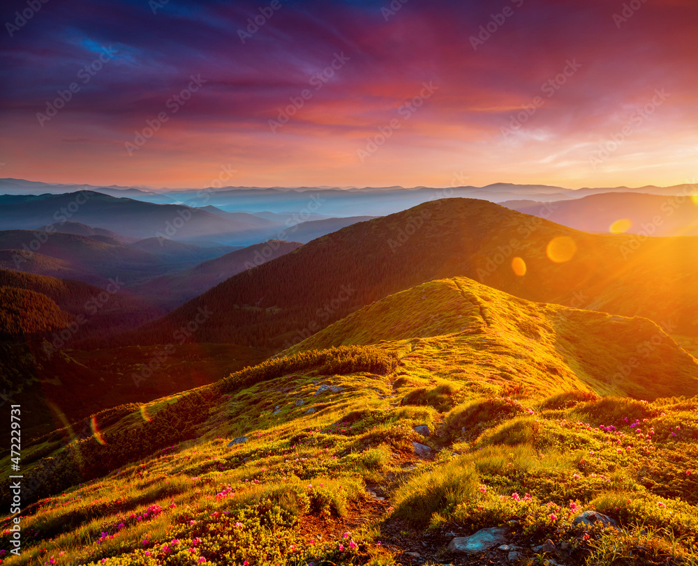 Scenic landscape in summer day with green alpine meadows. Carpathian mountains, Ukraine.