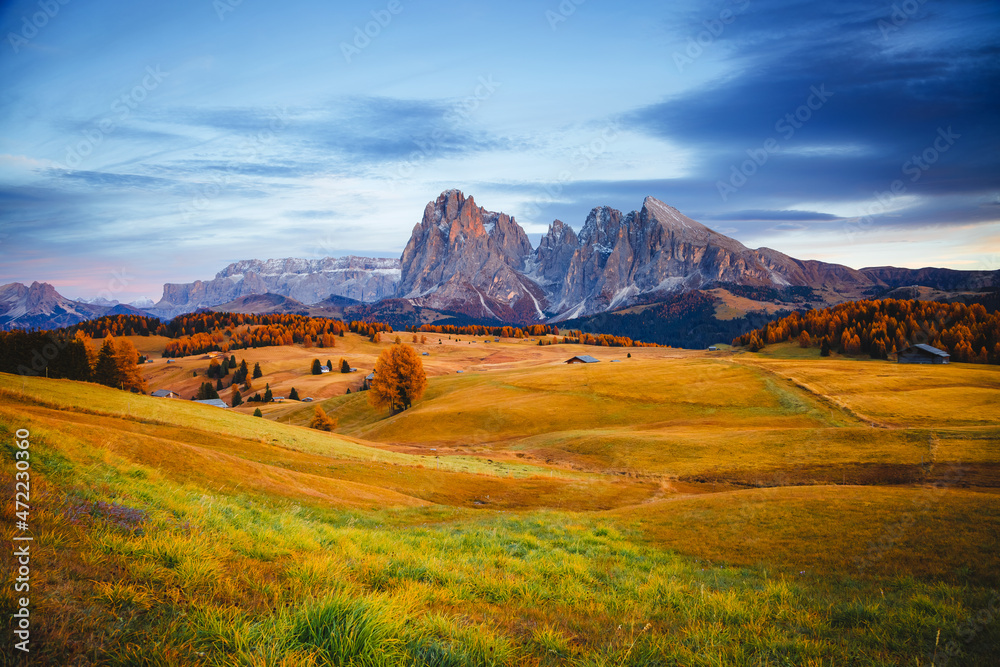 Gorgeous morning scene in Compaccio village and bright larchs. Dolomite alps, Alpe di Siusi, South Tyrol, Italy, Europe.