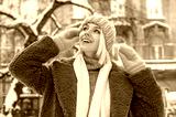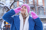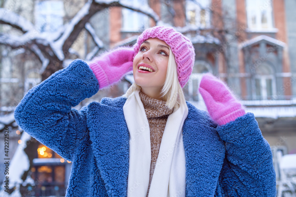 Winter holidays, Christmas, vacation conception: happy smiling fashionable lady walking in street. Model wearing pink knitted beanie hat, mittens, blue faux fur coat. Copy, empty space for text
