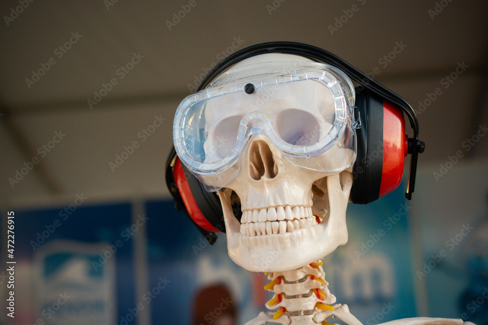 Still life skull with ggoggle and headphone on abstract background
