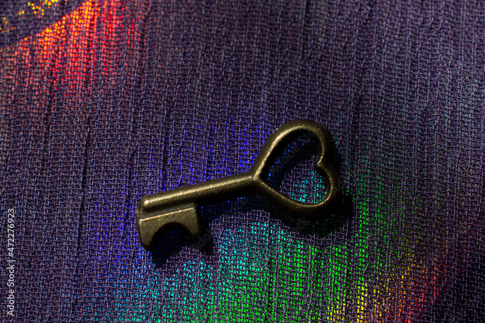 Vintage key. .Antique key. Retro key with a heart shape on on colorful fabric