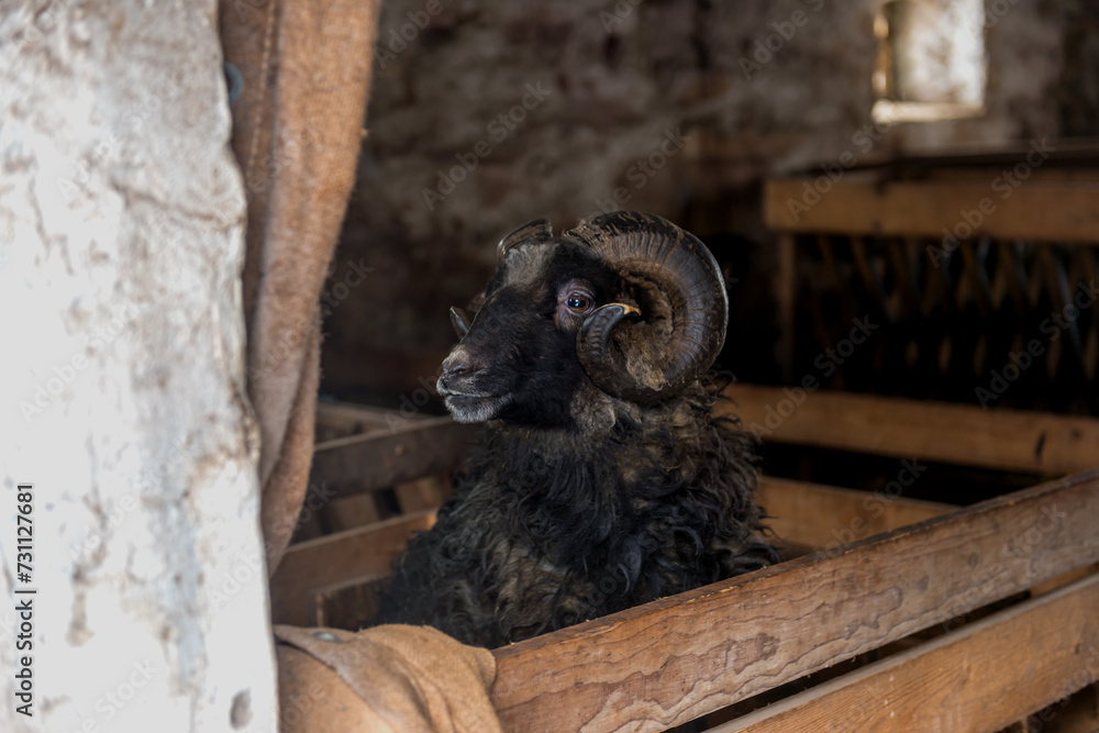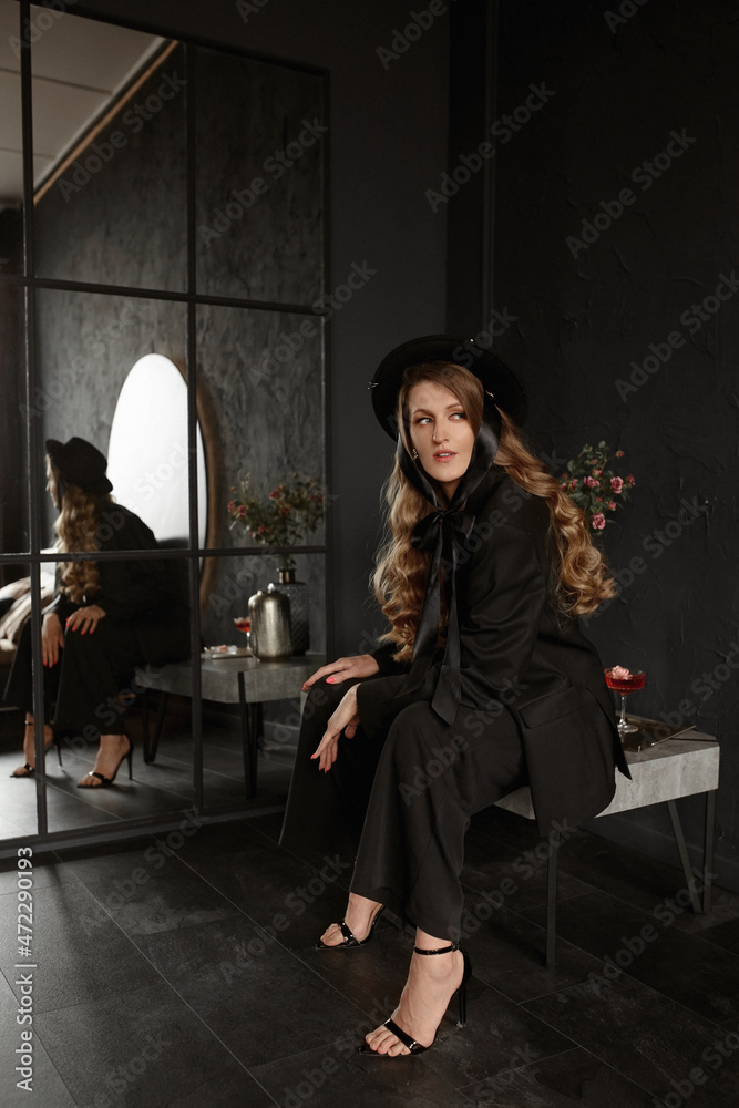 Stunning woman in a trendy hat and stylish black suit in dark luxurious interior