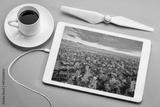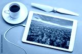 sunrise over city of Fort Collins and Front Range of Rocky Mountains in northern Colorado in a fall scenery, reviewing an aerial image on a digital tablet