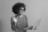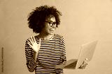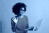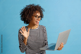 Joyful multiethnic lady doing hello gesture and laughing while holding notebook and talking with friend through video call. Isolated on blue background
