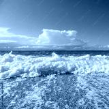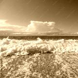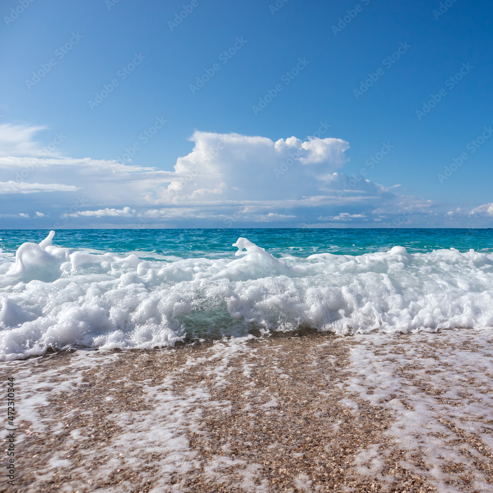 Shining white foam droplet on pebble beach with waves and epic clouds on coast of Lefkada island in Greece. Summer nature of Ionian Sea