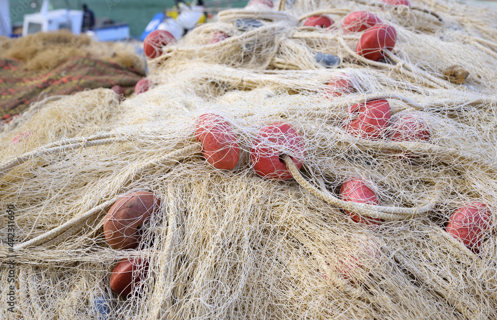 Close up, detail view and background of used fishing nets that have been laid one on top of the other in front of a harbor and fishing boats in the background