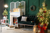 Interior of stylish living room with green sofa, fireplace and Christmas trees