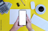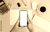 Man is using a smartphone. In his office, a businessman is hard at work. Freelancing, student life, e-learning, studying, web site, technology.